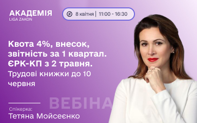 Вебінар "Квота 4 %, внесок, звітність за 1 квартал. ЄРК-КП з 2 травня. Трудові книжки до 10 червня"